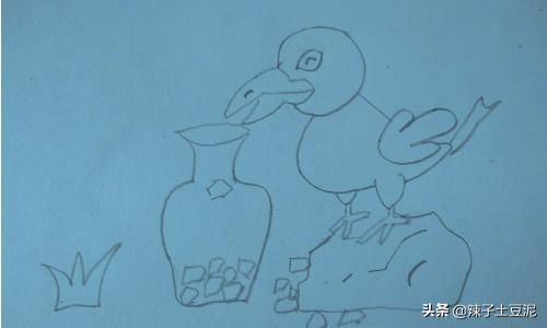 8、然后画出瓶子里面的石头和水。还有乌鸦投进瓶子一半的石头。这样乌鸦喝水就画好了。最后把乌鸦喝石头涂黑了。
